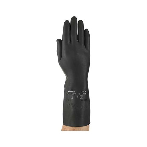 - Găng tay chịu Axit Alphatec 87-118 – Ansell là loại găng tay bảo hộ được làm từ chất liệu cao su latex tự nhiên có khả năng chống thẩm thấu và độ đàn hồi cao